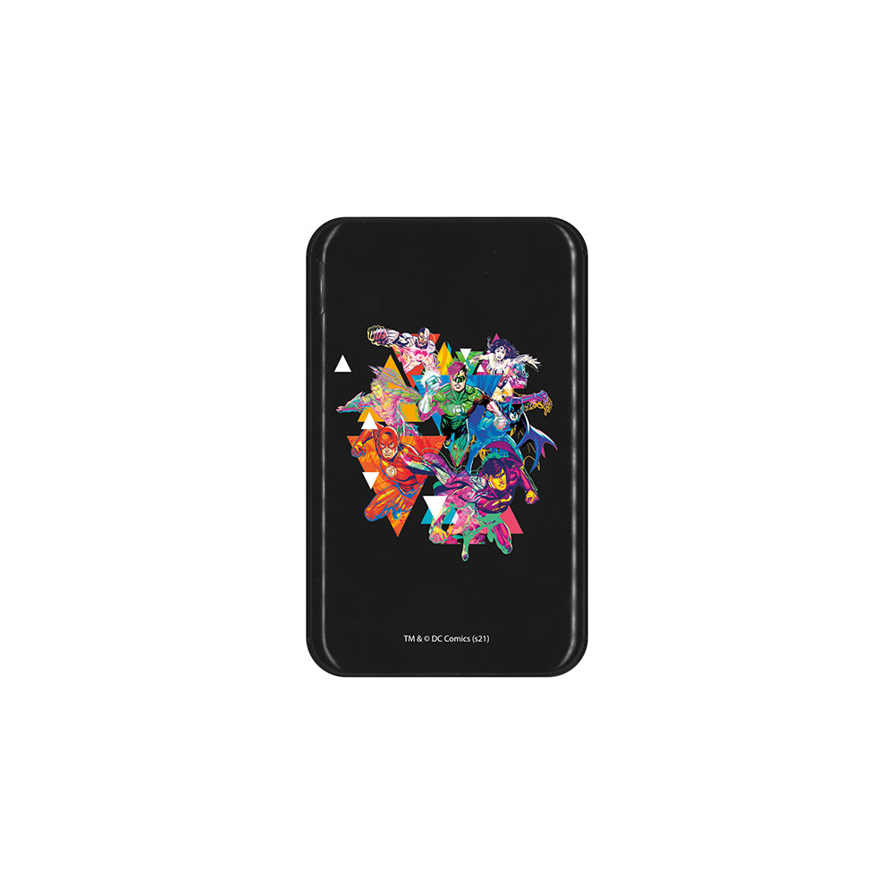 Una batería externa negra de 5000 mAh con una impresión en la parte delantera de todos los superhéroes que forman la liga de la justicia de DC Comics.