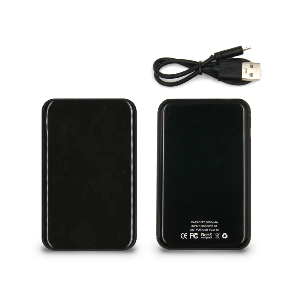 Powerbank de carga rápida de 5000 mAh con cable de carga incluido, luz led que indica cuando se esta cargando. Una entrada USB y dos salidas, cargador móvil portátil de color negro. Proporciona cargas completas para cualquier tipo de dispositivo móvil.