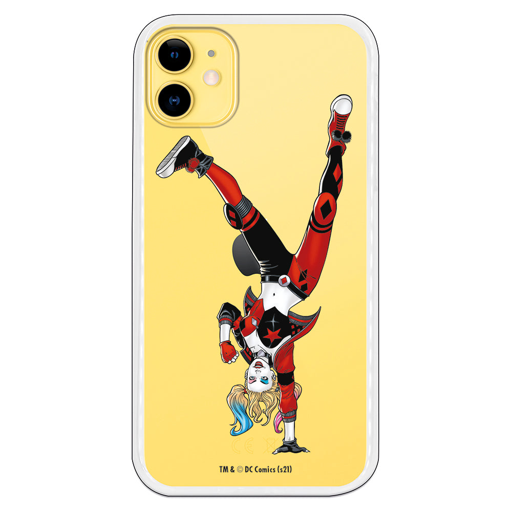 Funda iphone Harley Quinn dando volteretas con una mano fondo transparente DC Comics oficial