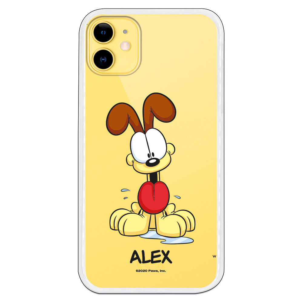 Diseño de Garfield Odie Personalizado 100% transparente con la posibilidad de colocar tu nombre donde quieras de la superficie del diseño. Una funda de silicona transparente con una impresión de inyección de tinta. En este diseño tienes la posibilidad de poner tu nombre, el de algun familiar tuyo o cualquier nombre al que le quieras hacer un regalo original y único. Es un diseño con Odie, el perro de Garfield con la tipografía oficial de la licencia. Con la posibilidad de colocar el nombre donde quieras del diseño y cambiar el color del texto.